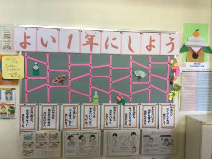 保健室前の掲示物がリニューアルしました。門松や鏡餅などの飾りもあり、新年らしく華やかです。