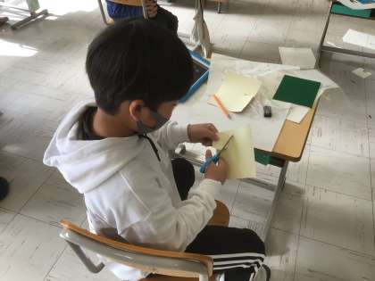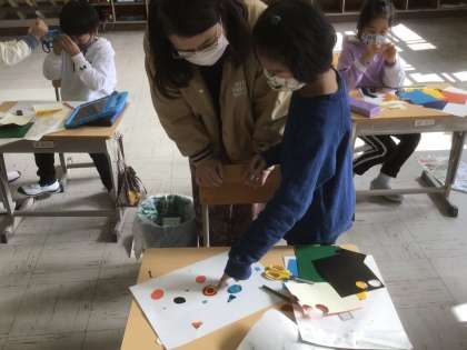 2年生教室で図工の授業を行っています。黒板に「はんが」と書いてありますが、子どもたちはカラフルな紙をハサミで切り、台紙に貼り付けています。「なるほど、紙版画か…」と思ったのですが、それもちょっと違うようです。