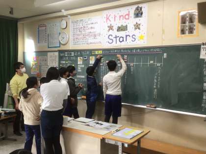 今回の授業は、自分の立場を示すネームプレートを黒板に貼って意見交換をしながら、誠実に生きるとはどういうことか考えました。男の子との約束と夢に見続けてきた大舞台、自分だったらどちらを選ぶのか、子どもたちも悩んでいました。自分とは違う意見を聞くと、ネームプレートの位置も微妙に変化します。どの子も友だちの意見を真剣な表情で聞いていました。