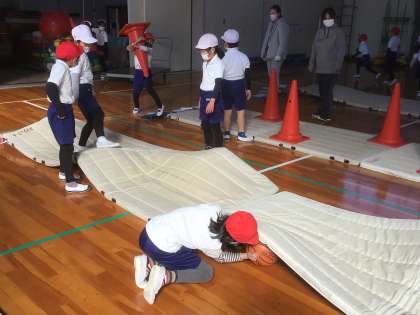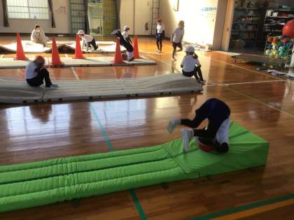 2/9 マットあそび(1・2年生 体育) 公開日 2022/02/09 更新日 2022/02/09 お知らせ ロイター板や三角コーン、ボールなどを使って、でこぼこコースやぐにゃぐにゃコースを作り、前まわりや後ろまわりの練習をしました。 障害物を避けるためには真っすぐに回らなければなりません。また、後ろまわりをするときは、後ろの様子が分からないので回る前によく確かめておくことが必要みたいです。
