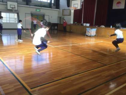 前半は縄跳びをしました。高学年になると、二重とびやはやぶさ(あや二重とび)、つばめ(交差二重とび)も練習します。