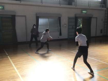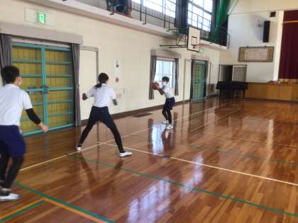 後半はバスケットボールです。パスを通す側とブロックをする側に分かれて練習をしました。移動しながらパスをもらったり、フェイントを入れたパスをしたりするなどの工夫も見られました。