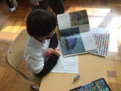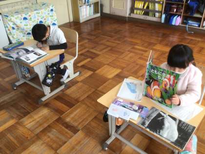2/16 しらべてみよう(1年生 国語) 公開日 2022/02/16 更新日 2022/02/16 お知らせ 他の動物たちが、子どもを守ったり餌を取ったりするためにどんな工夫をしているか、図書室の本を使って調べました。 スジオテンジクダイが口の中で卵を守ったり、クロコサギが羽を日傘のように広げて餌を探したりするのを読んで感心しながらプリントに書き出していました。