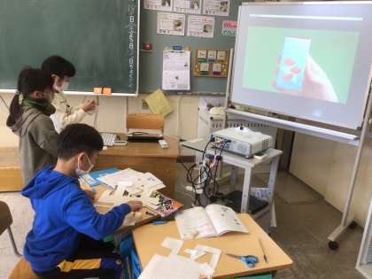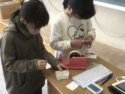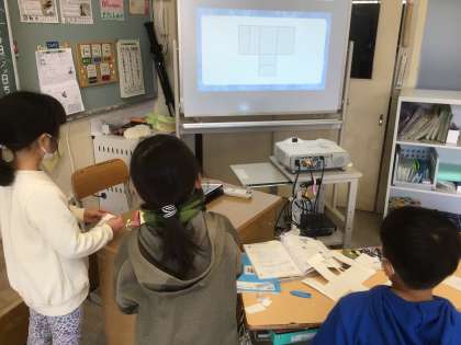 2/18 はこづくり(2年生 算数) 公開日 2022/02/18 更新日 2022/02/18 お知らせ 今日は、6つの面を組み立てて箱の形を作ります。 箱を観察してみると、同じ形の長方形が2つずつ向かい合って3組あることが分かりました。早速工作用紙を切って作ってみました。