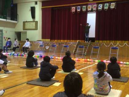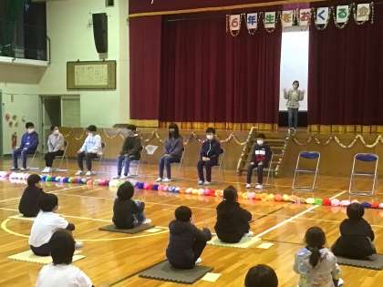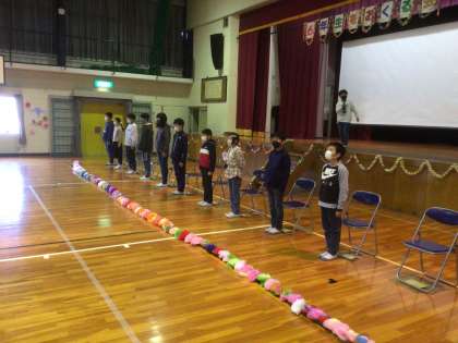 名前を呼ばれた6年生が順番に舞台から登場し、みんなで拍手で迎えます。