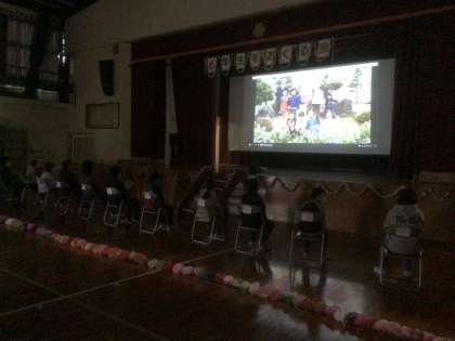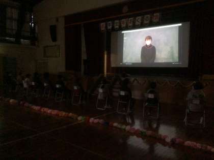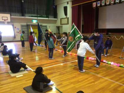 3/7 6年生を送る会 その3 公開日 2022/03/07 更新日 2022/03/07 お知らせ ゲームの後は、6年生が入学してから今までを振り返る思い出ビデオを見ました。ビデオの最後には、お世話になった先生が登場し、6年生に対してメッセージを送ってくれました。 次に、青少年赤十字や緑の少年団、少年消防クラブなどの引き継ぎ式を行い、6年生から代表の4・5年生に団旗が渡されました。