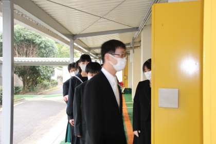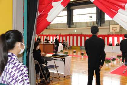 卒業生が緊張気味の表情で入場します。 温かい拍手で迎えてもらいました。