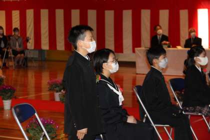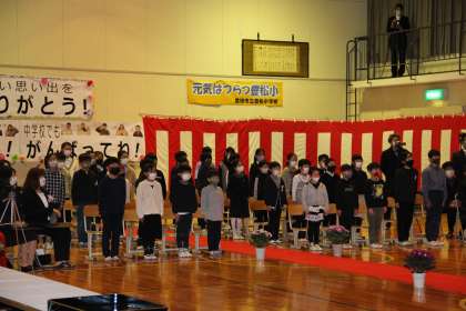 在校生の中で一番前に座っている1年生と5年生が在校生を代表して、大きな声で「ありがとう」「中学校でもがんばってください」の言葉を届けました。