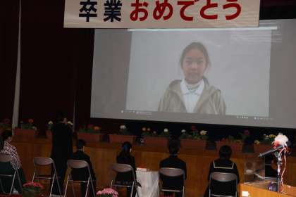 在校生のお祝いの言葉です。コロナ対策のため、大きな声が出せないので、事前に録画しておいたビデオを流しました。卒業生一人一人に対して、小学校での思い出と感謝の言葉を伝えました。