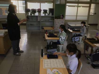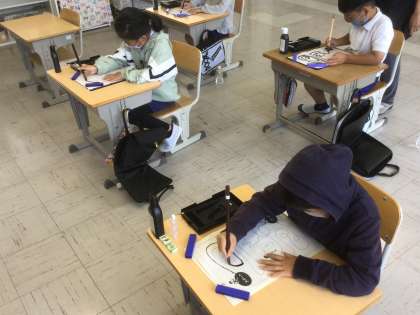 今日の授業は、用具の置き方や墨汁の使い方、筆の毛先の下ろし方を教えてもらい、筆を使って線をなぞる練習をしました。