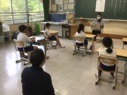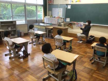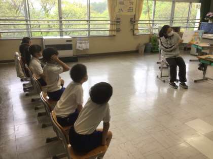 今日は5名のボランティア(河合さん、宇野さん、大原さん、杉山さん、伊藤さん)に来ていただき、各教室で絵本や物語を読んでもらいました。