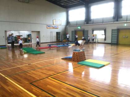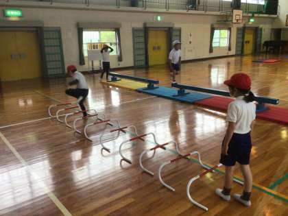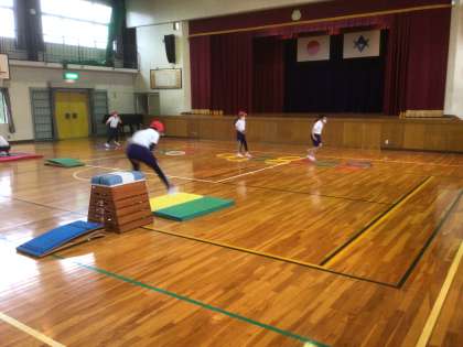 4/15 サーキットトレーニング(3・4年生 体育) 公開日 2022/04/15 更新日 2022/04/15 お知らせ 平均台、マット、とび箱、フラフープ、ハードルを使ってトレーニングコースを作って体を動かしました。 一人2周ずつコースを回ると、新しいコースが追加されたり、跳ぶ距離が少し長くなったりして難易度が上がっていきます。授業が終わる頃にはコースは体育館いっぱいに広がりましたが、子どもたちは最後まで元気に走り回っていました。