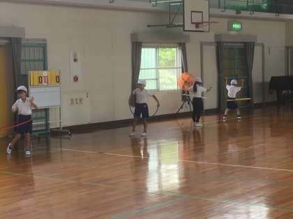 フラフープ回しにも挑戦しました。上手な子は、タイミングよく腰を前後させ、小さな動きなのにくるくるよく回せます。
