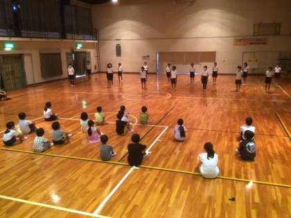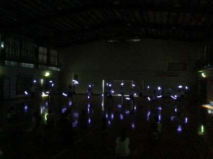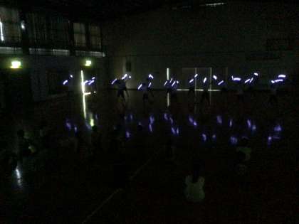 キャンプでの個人の目当てを発表すると、体育館の照明が落ち、ソーラン節の曲に合わせて蛍光色のライトの光が動き始めました。