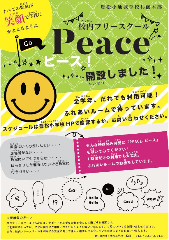 校内フリースクール 公開日 2022/08/18 更新日 2022/08/18 校内フリースクール 校内フリースクールのお知らせを再掲します。 9月の開催予定は、作成中です。しばらくお待ちください。 校内フリースクールのお知らせ 校内フリースクール
