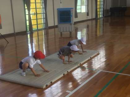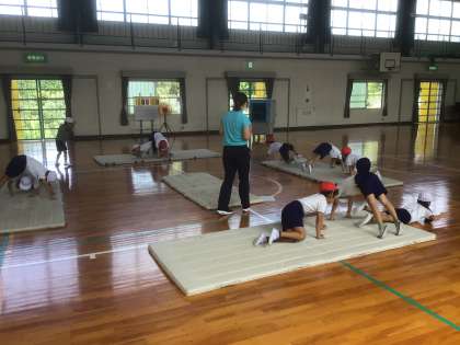 マットの上で、首倒立やカエル倒立、川とびやトンネルなどのいろいろな技に挑戦しました。