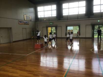 ポートボールのゲームをしました。ガードマンに取られないように速いボールを投げるとゴールマンがキャッチできません。相手のことを考えて取りやすいパスを送るのがコツみたいです。