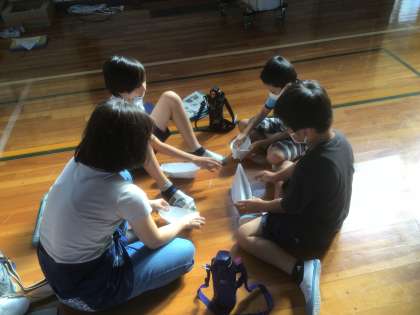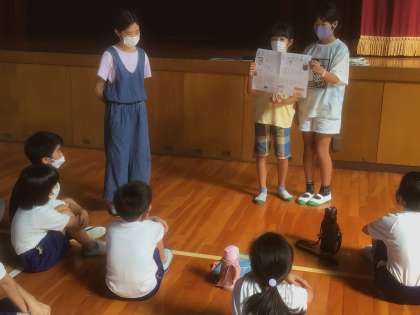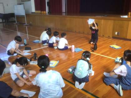 5年生はひよどり学習(総合的な学習の時間)に、防災について学んでいます。これまでに学んできた中から、避難する際に知っておいてほしいことをクイズ形式にして発表したり、紙を使った食器の作り方を紹介したりしました。