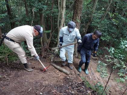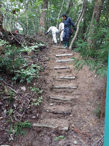 プレイパークへのルート整備 その2 公開日 2022/10/13 更新日 2022/10/13 お知らせ ひよどりコースからの入口です。 かなり急な斜面ですが、階段を細かく設置してくださったお陰で、とても楽に登れます。