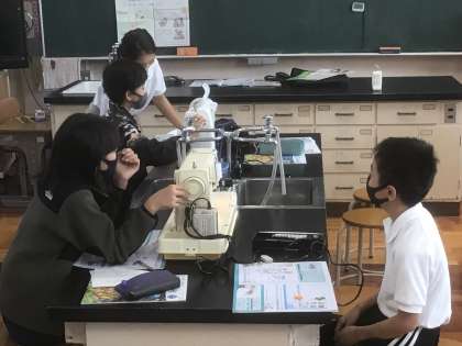 「はずみ車を回すと、針が動く」など、実際に動かして確かめながらの学習です。