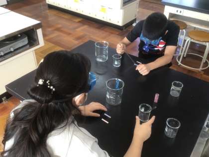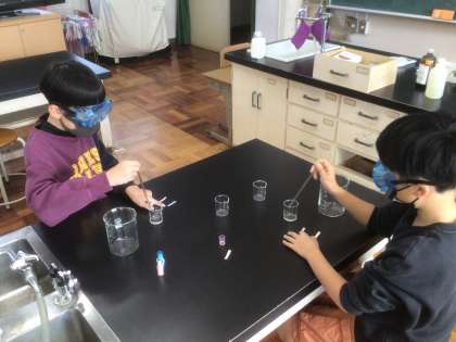 水溶液の性質(6年生 理科) 公開日 2022/11/18 更新日 2022/11/18 お知らせ リトマス紙を使って、水溶液の性質(酸性・アルカリ性)を調べます。 初めて使う塩酸とアンモニアに興味と怖さが半々です。手であおいでにおいを確かめました。アンモニアのにおいはしばらく忘れないでしょう…。 安全のため、保護メガネをつけて実験をしました。