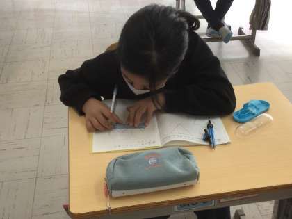 次に、3cm離れた二つの点をそれぞれ中心にして半径3cmの円を二つかき、二つの中心と円が交差した点を結んで三角形を書きました。今度は誰の三角形も正三角形みたいです。なぜそうなるのか考えました。