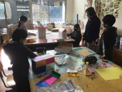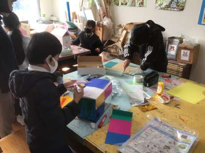 縦方向の力には強いのですが、横向きの力を加えると簡単に折り曲げることができます。こうした特徴を生かしたり、仕切り・たな・引き出しなどのパーツを加えたりして、オリジナルのおもしろボックスを作ります。