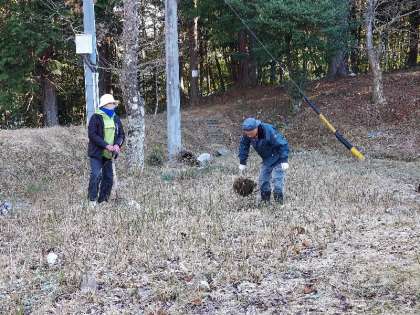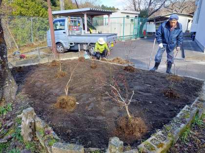 公務手さんと校内整備員さんが、運動場の北側に植えられていたブルーベルーの木を校舎南側の畑に移植してくださいました。