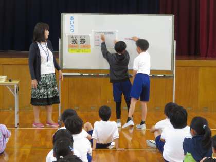 交通安全の感謝状と愛知県緑化功労賞の賞状およびは盾については、委員会やクラブの代表児童に授与しました。「校長先生のお話」では、「あいさつ」についてお聴きしました。挨拶を進んでできる二人の児童が、校長先生のお手伝いをしてくれました。聴いているみんなの姿勢も、とても素晴らしかったです。
