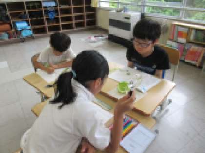 キャベツを食べるアオムシを虫眼鏡で観察していました。観察したことは、観察日記に詳細に記録しました。