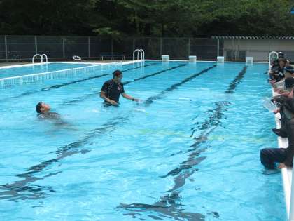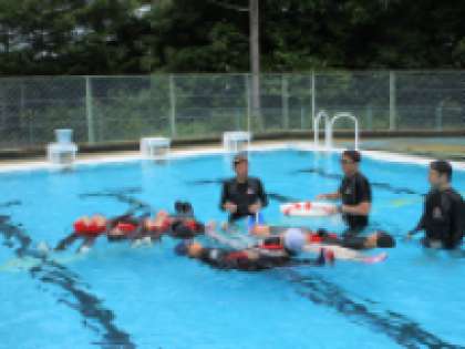 はじめに、いざという時に救助を待つための浮き身を教えていただきました。着衣のままやペットボトルをもって水に浮く体験をしました。はじめは恐る恐る行っていましたが、少しずつ慣れて上手に浮けるようになりました。他にも、溺れている人を見つけた時の対応の仕方や、ライフジャケットなどの道具を着用して水に入る等、日頃できない貴重な体験をすることができました。