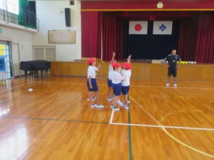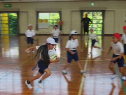 2チームに分かれて、はじめに、ラグビーボールのパス練習を行いました。「おにぎりを作って、名前を呼んでパスをもらう」というポイントを教えていただいたのでどちらのチームも上手にできました。次にタグを取る練習を行いました。子どもたちは30秒間でたくさんのタグを取ることができました。最後にミニゲームを行いました。竹井様に教えていただいたことを生かして、パスを回し、トライすることができました。互いに譲らず大接戦で大いに盛り上がりました。