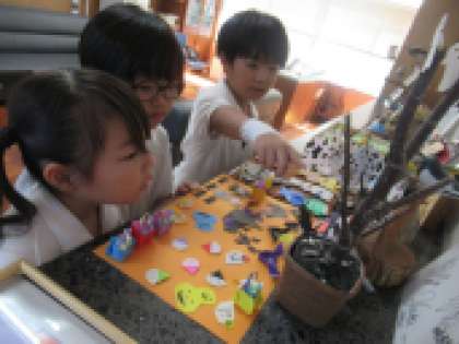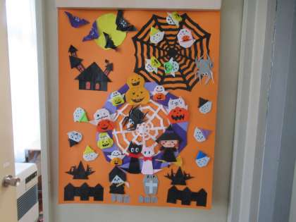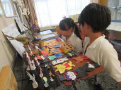 昨日は、2年生の子どもたちが、遊びに来てくれました。ハロウィンの飾りを見て、「かわいい」「作ってみたい」と興味津々でした。折り紙だけではなく、トイレットペーペーの芯なども使って作られていることに、とても驚いていました。今度は、自分たちも作ってみるそうです。楽しみです!