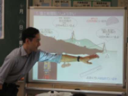 3時間目は、内村様による地図教室を行いました。国土地理院の仕事内容、地図のつくり方地図記号等について、パワーポイントを使って分かりやすく教えてくださいました。