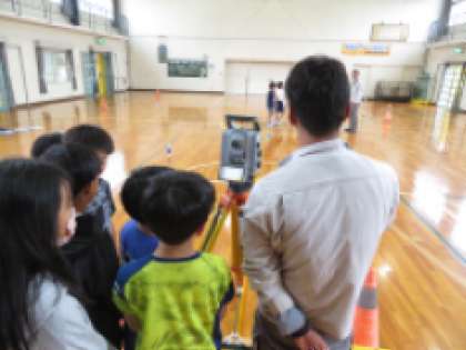 4時間目は、体育館で測量体験を行いました。まずは、10m歩いて距離を測り、1歩の長さを確認しました。次に、ドッジボールを投げ、ボールが飛んだ距離を歩幅で測り長さを予想しました。次に測量機器を使って、正しい長さとの誤差を確認しました。1位は校長先生。なんと誤差「0.01m」という僅差。講師の先生方も驚いてみえました。最後にみんなで測量機器を覗いたり、棒を持って動かしたりしました。「ここに反応しているんだね」「8mだったよ、予想通り」など、子どもたちが嬉しそうに話し合う様子を見て、実際に体験して学ぶことのよさがよく伝わってきました。