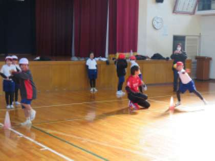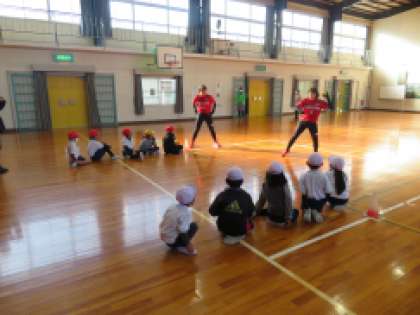 12月17日(火)2時間目、「とよたスポーツ体験講座」の投げ方教室を体育館で行いました。トヨタレッドテリアーズの選手が2名来てくださり、1・2年生に楽しく丁寧にボールの投げ方を教えてくださいました。