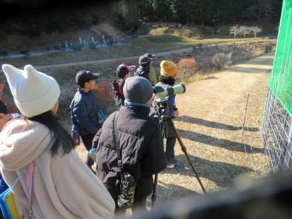 1月17日(金)。本年度最後の探鳥会は中学年でした。とても寒い日でしたが、全員で元気に行くことができました。今日は行く先々でジョウビタキに出会いました。探鳥会の先生が望遠鏡を使って鳥を見せてくださるので、大きくしっかり見ることができました。