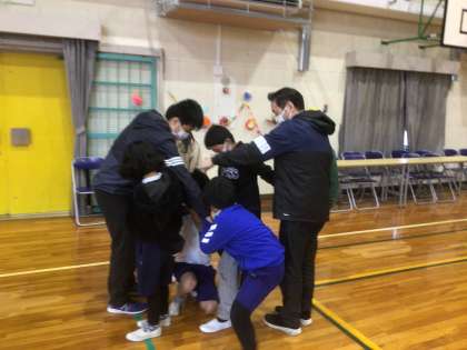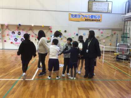 みんなで楽しんだゲームは、なかよし班対抗「人間知恵の輪」。5年生が、全校が楽しめるようにと考えてくれました。どの班の子どもたちも先生も、笑顔で遊んでいました。