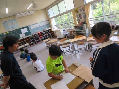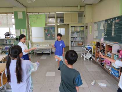 4班「新聞じゃんけん」、5班「お絵描き伝言ゲーム」、6班「ジェスチャー伝言ゲーム」を行いました。
