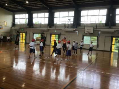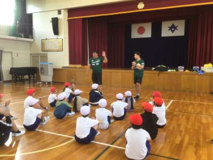 本日2時間目、トヨタヴェルブリッツの谷口さんと山口さんが、本校に来てくださり、3〜6年生を対象に、「タグラグビー教室」をしてくださいました。