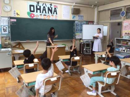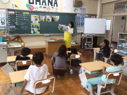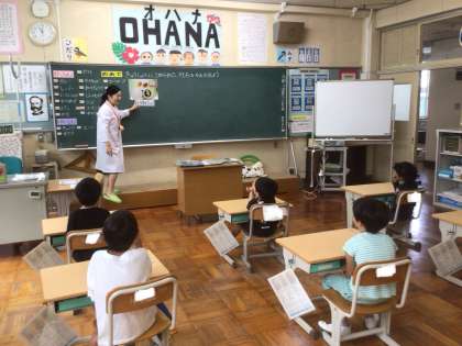 市内の栄養教諭さんと給食センターの調理員さんをお迎えし、食に関する指導の授業をしていただきました。1年生の子どもたちは、積極的に手をあげて発言したり、思ったことを口々に呟いたりして、楽しく授業に取り組んでいました。