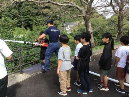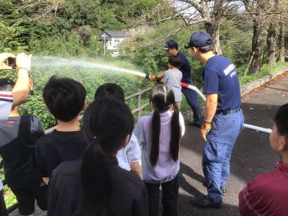 豊田市中消防署松平出張所では、お話を聞いたり、放水体験をさせていただいたりしました。