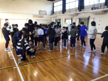 本校では、毎月月初めに全校朝会をしています。本日の朝会では、校長先生から「学芸会を頑張ってくれてありがとう。今日の「あ」は「あそびましょう」のあです」とのお話がありました。校長先生が画用紙で作ってくださった「たまご」をペアリングします。制限時間は3分間。子どもたちは「青を持っている子来て」「裏返したらどうかな」など高学年を中心に声を掛け合いながら、一生懸命ペアを探しました。なんと3分以内に全てのたまごが完成しました。校長先生がいろいろなアイデアでお話をしてくださるので、どの子も毎月のお話を楽しみにしています。