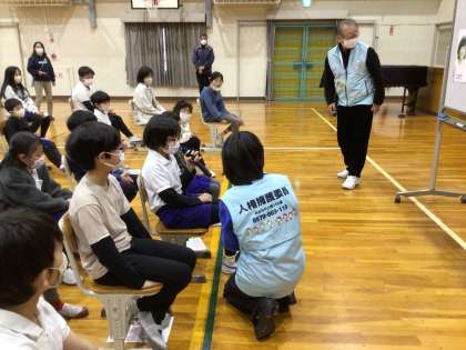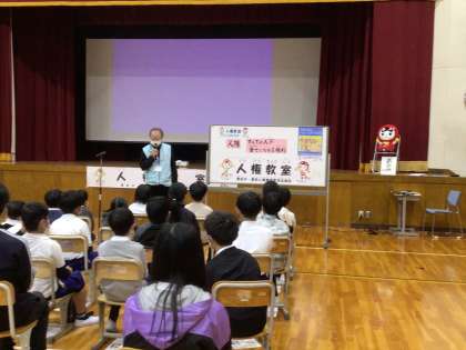 本日、人権擁護委員の皆様をお招きして、全校で人権移動教室を行いました。「人権」についてのお話を聴いた後、DVD「いじめ 心の声に気づく力」を視聴したり、「人権クイズ」に挑戦したりして、人権についての理解を深めることができました。全員が真剣に「人権」について考え、相手のことを思いやる心をもって学校生活を送りたいという気持ちを高めることができました。