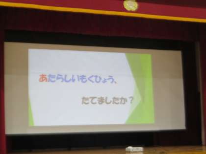 1/7 【全校】冬休み明けの全校朝会 公開日 2026/01/07 更新日 2026/01/07 学校行事 明けましておめでとうございます。学校に子どもたちの元気な声が戻ってきました。令和8年初の全校朝会では、新年の始まりにあたり、校長先生からお話がありました。「新年の目標について」のお話や「笑う」ことの効果についてのお話など、スライドを使って分かりやすく教えてくださいました。今年も「笑顔いっぱい」の豊松小学校にしていきましょう。