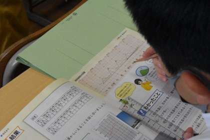 自記温度計のグラフを読み取り、一日の気温の変化について学習していました。