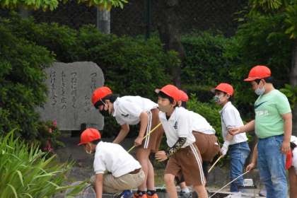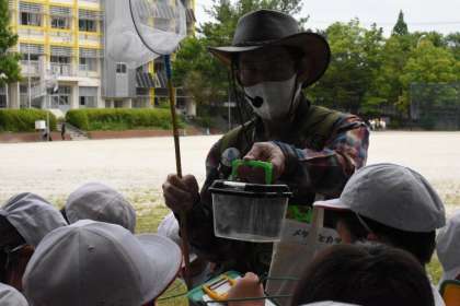 土橋小学校にいる生き物をみんなで調べました。子どもたちは、夢中になって生き物を探し、青山さんに質問をしていました。