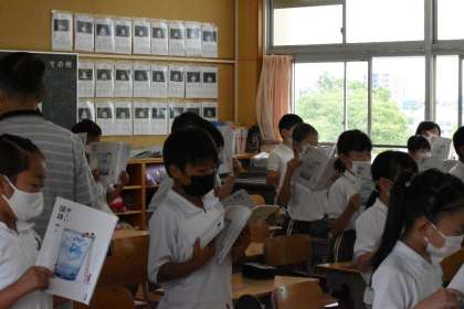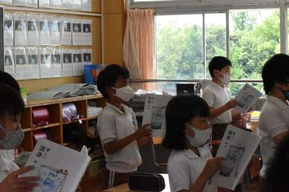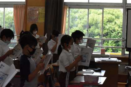 起立をして、正しい姿勢で、声を合わせて音読の練習です。