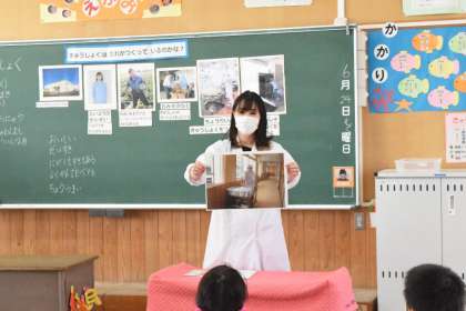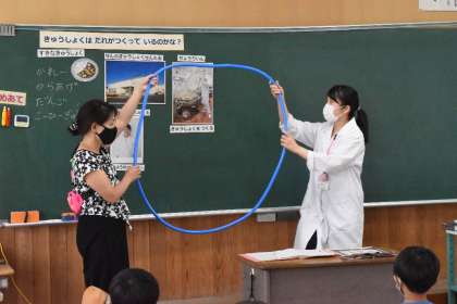 テーマは「きゅうしょくはだれがつくっているのかな」です。給食センターのことやそこで働いている人たちのことなど、毎日食べている給食がたくさんの人たちのおかげでできていることを学びました。