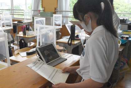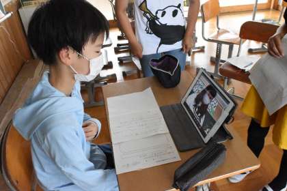 そこで、5・6年生がコラボして、今日は委員会活動について、5年生が6年生にインタビューするという形式で行いました。合わせて、iPadを活用してリモートで行いました。